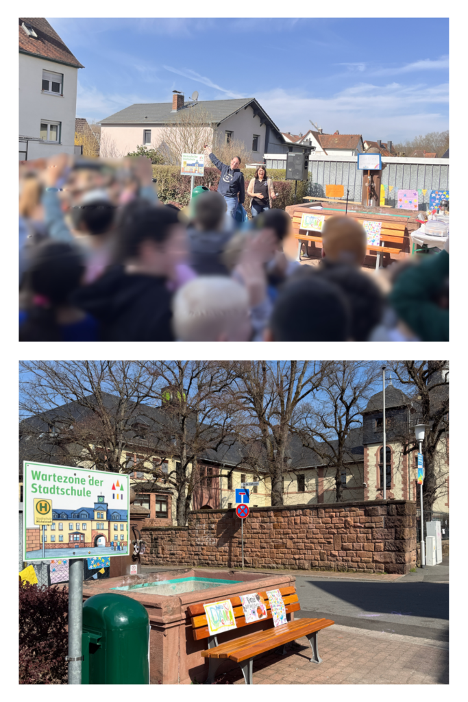 Am 19.3.26 wurden die Wartezonen für Eltern an der Stadtschule eingeweiht. Die Kinder der Stadtschule haben sich im Schülerrat gewünscht, dass der Bereich vor dem Schultor frei von wartenden Menschen bleiben soll. Nach intensiven Vorbereitungen und Gesprächen wurden am 19.3.26 3 Wartezonen für wartende Eltern eingerichtet. Die Einweihung und Enthüllung der Schilder war eine wunderschöne kleine Feier mit Infoständen, Kuchenbuffet und gemeinsamen singen des Stadtschulliedes. wir sind uns sicher, dass die Eltern Ihre Kinder unterstützen und ihnen zutrauen: ab hier schaffen es die Kinder alleine.