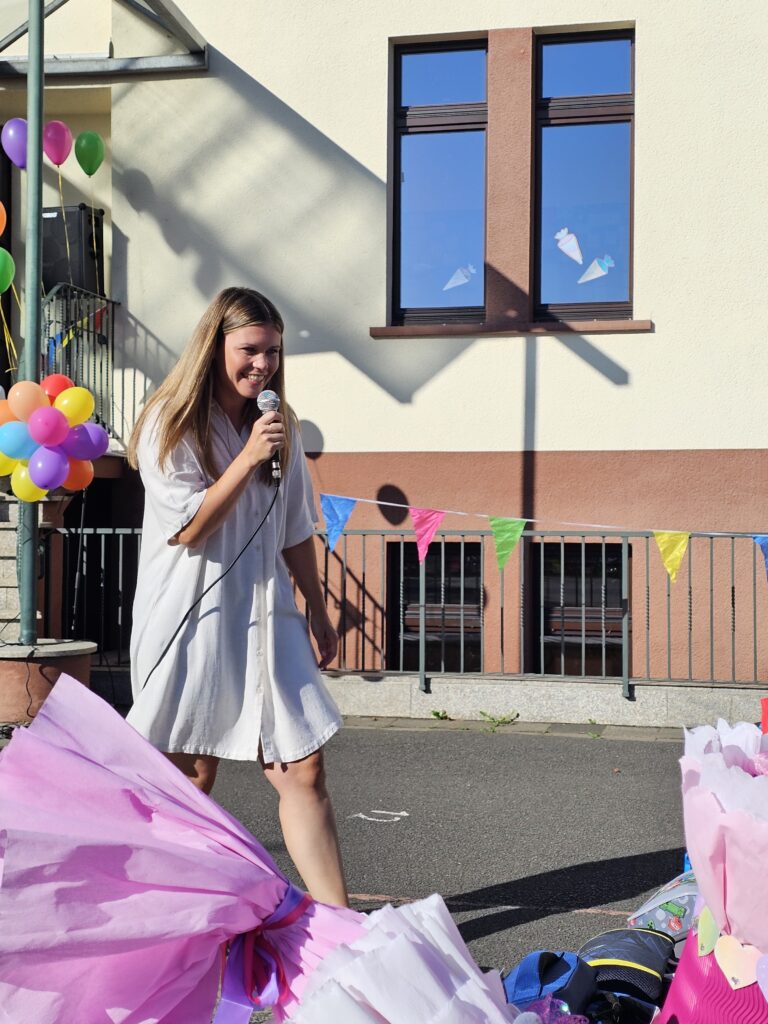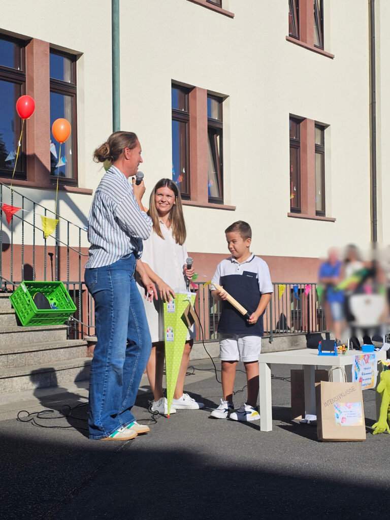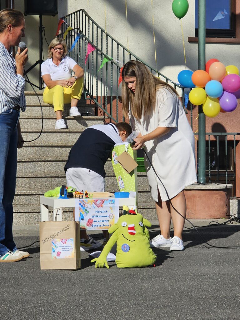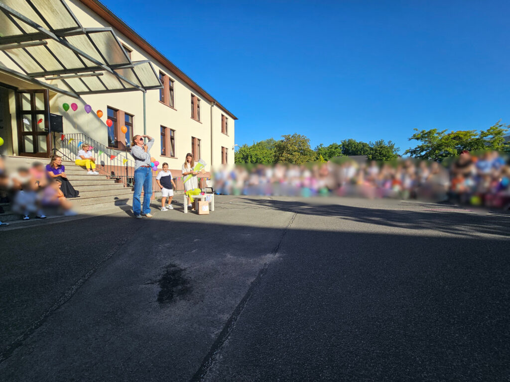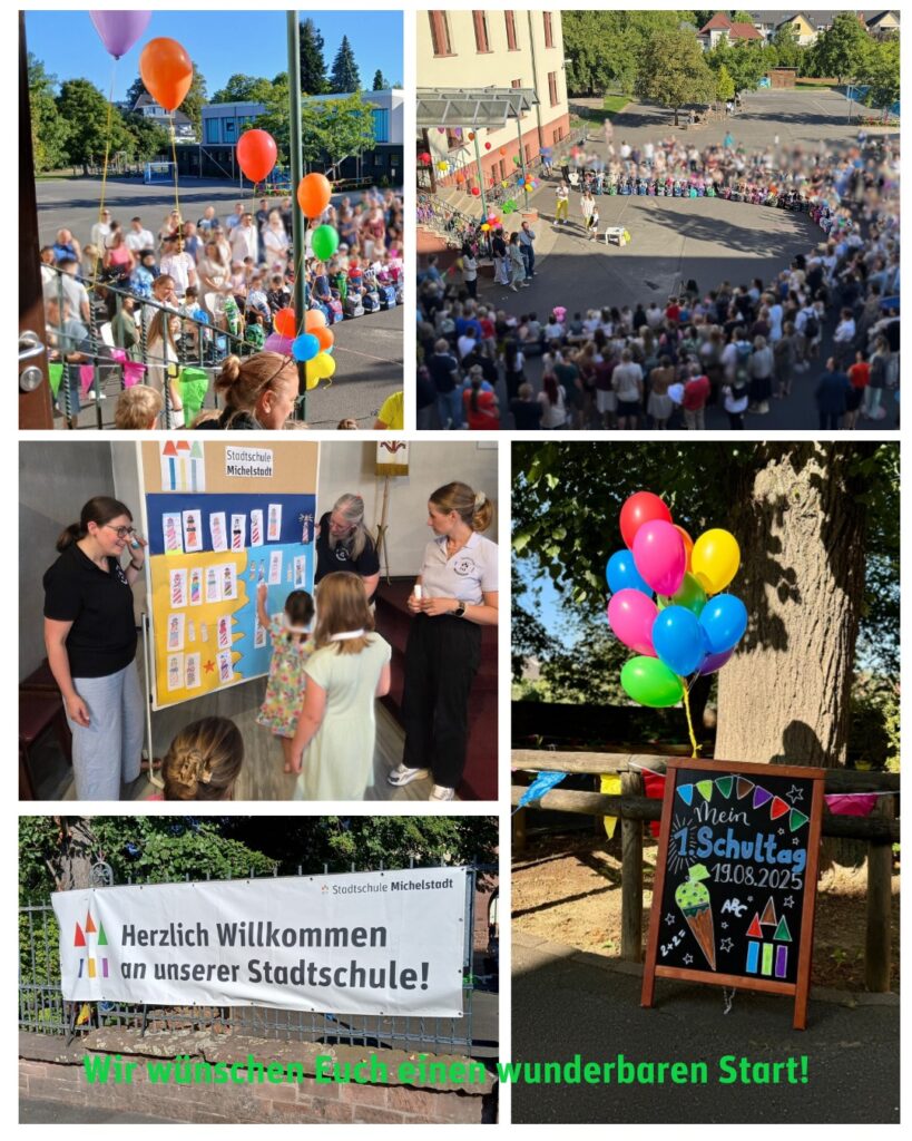 Bei strahlendem Sonnenschein und auf einem bunt mit Fähnchen und Luftballons dekorierten Pausenhof, wurden am vergangenen Dienstagmorgen die neuen Erstklässler und Erstklässlerinnen der Stadtschule Michelstadt als Ehrengäste des Tages herzlich begrüßt, von ihren Mitschülern und Lehrkräften willkommen geheißen und in die Schulgemeinschaft aufgenommen. Die Einschulungsfeier wurde durch die Klasse 2a mit einem eingeübten Klatschrhythmus eröffnet. Alle zweiten Klassen sowie die Intensivklasse hatten zudem ein passendes Lied zum Schulstart eingeübt und vorgetragen. Selbst die Kindergartenkinder der Kita am Stadthaus ließen es sich nicht nehmen mit zwei eigens einstudierten und umgedichteten Liedern die Feier zu bereichern. Frau Trumpfheller, die Konrektorin und kommissarische Schulleitung der Stadtschule, hatte dem Anlass entsprechend, eine große Schultüte dabei, aus der nach und nach einige besondere und wichtige Gegenstände für den Schulstart geholt wurden. Unterstützt wurde sie dabei von der Schulanfängerin Johanna, die direkt zu Beginn ein großes grünes Stofftier aus der Schultüte holte. Es war das „kleine Wir“, welches als Hauptfigur eines Bilderbuches für Zusammenhalt und Gemeinschaftsgefühl steht. Einige der Erstklässler kannten die Geschichte bereits und konnten erklären, dass überall, wo Liebe ist und Menschen sich mögen, das „kleine Wir“ erscheint. Das Bilderbuch dazu bekamen alle ersten Klassen geschenkt. Außerdem befand sich in Frau Trumpfhellers Schultüte eine Brotbox, ein Blinki, ein Gutschein über den Besuch des Minimathematikums, als kleine Aufmerksamkeit für jedes Kind zum Schulbeginn. Johanna griff noch ein paar weitere Male in die Schultüte und zauberte allerhand wichtige Dinge hervor, die man nun einmal braucht, wenn man in die Schule kommt. Im Anschluss an die Feier gingen die Schulanfänger mit ihren Klassenlehrer/innen Frau Karnovsky (Vorklasse), Frau Schäfer.-Koch (1a), Herr Koch (1b), Frau Amerongen (1c) und Frau Kasten (Intensivklasse) in die Klassensääle und hatten ihre erste gemeinsame Schulstunde. Alle Eltern wurden in dieser Zeit mit Kaffee und Kuchen durch den Förderverein der Stadtschule verköstigt. Insgesamt wurden an diesem Tag 84 Schulanfänger an der Stadtschule Michelstadt eingeschult. Wir wünschen Ihnen einen tollen Start ins Schulleben, viel Freude am Lernen aber auch, dass immer wieder Momente aufkommen, in denen sich das „kleine Wir“ unter sie mischt und der Zusammenhalt und Freundschaften ganz groß sind.